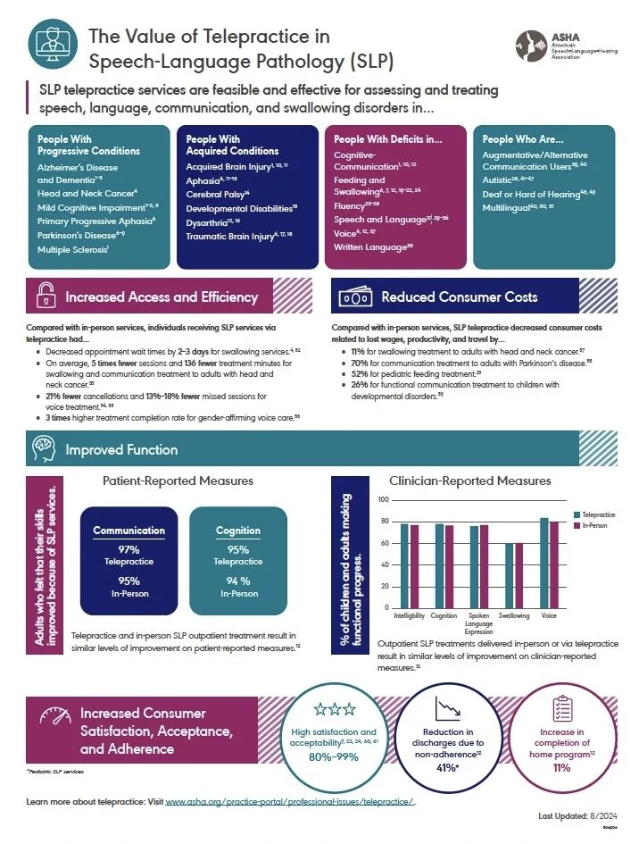 A growing body of research shows that telepractice and in-person therapy lead to similar improvements for most clients. For example, patient-reported and clinician-reported outcomes for communication, swallowing, and cognitive-communication treatment are nearly identical whether delivered online or face-to-face (American Speech-Language-Hearing Association, 2023).
